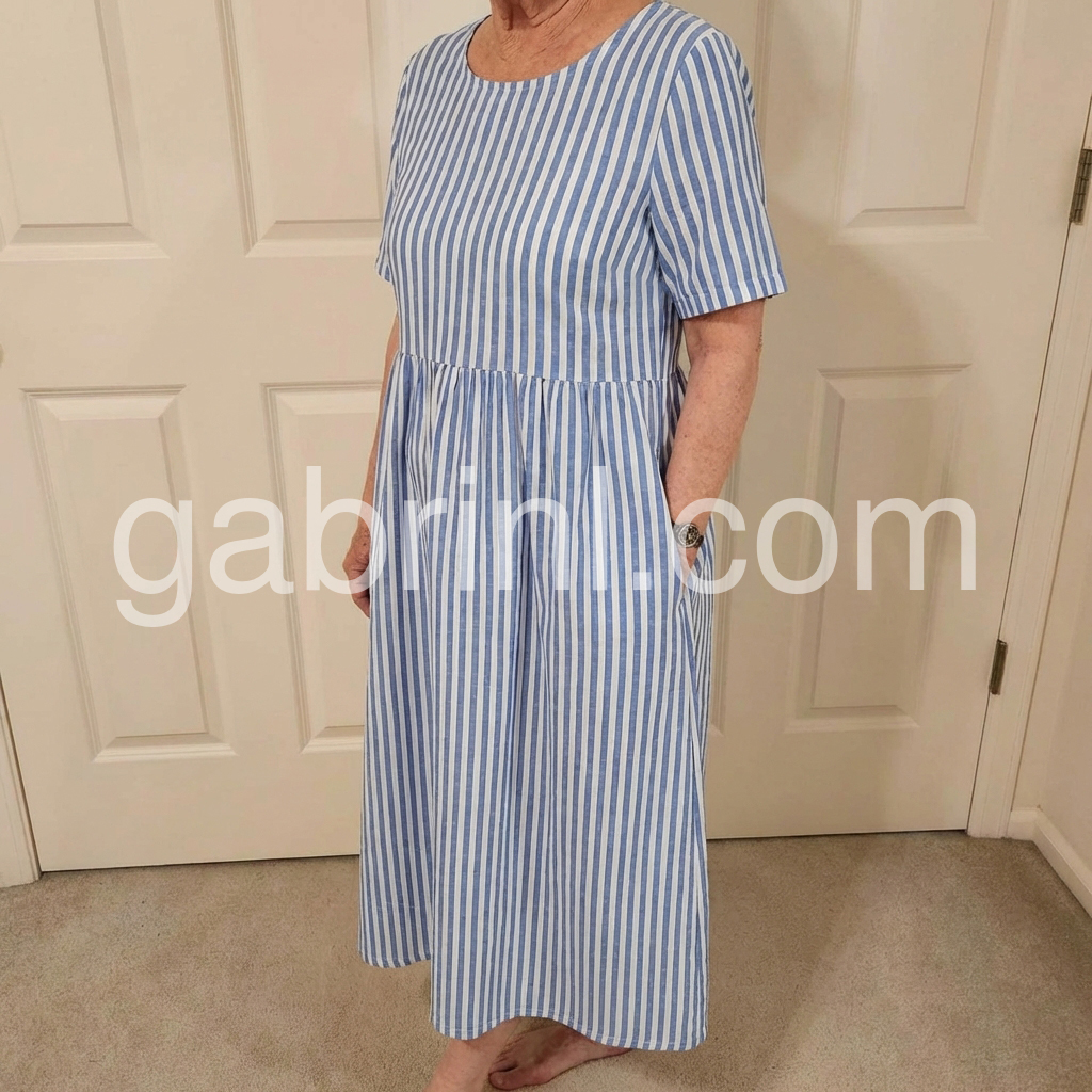 This dress embodies the essence of effortless Mediterranean chic. The classic vertical blue-and-white stripe print evokes a fresh, airy sensibility, perfect for sunlit escapes.