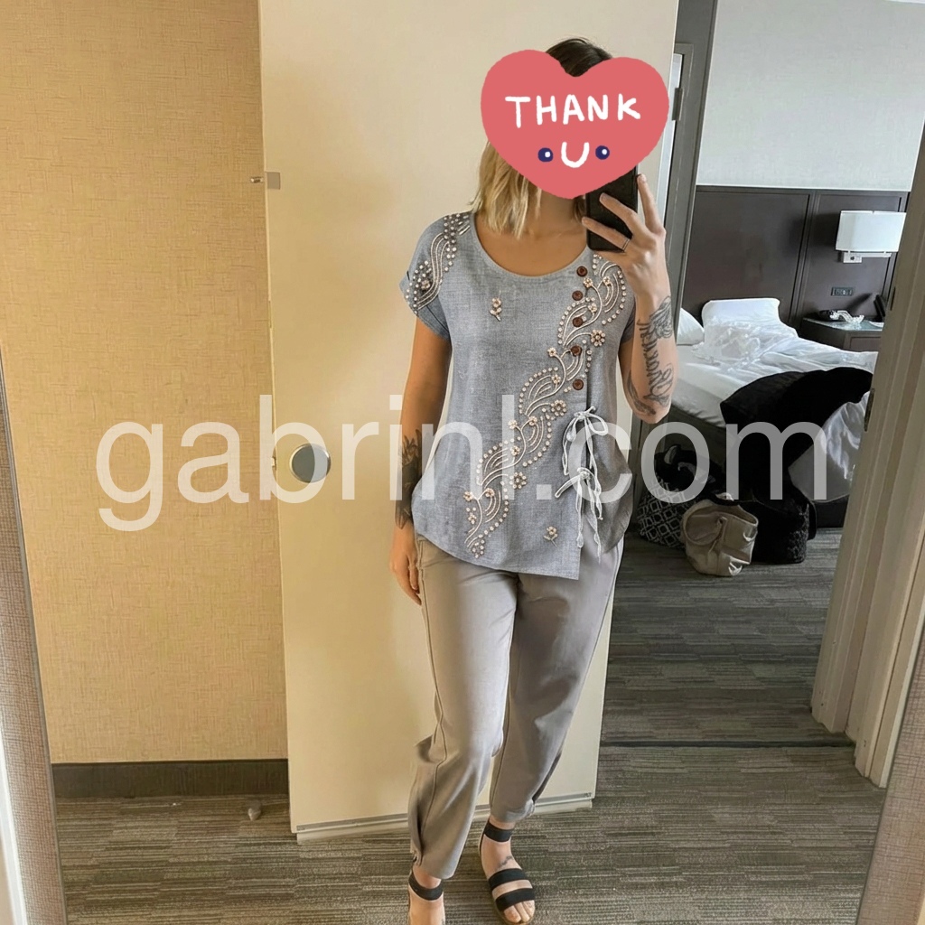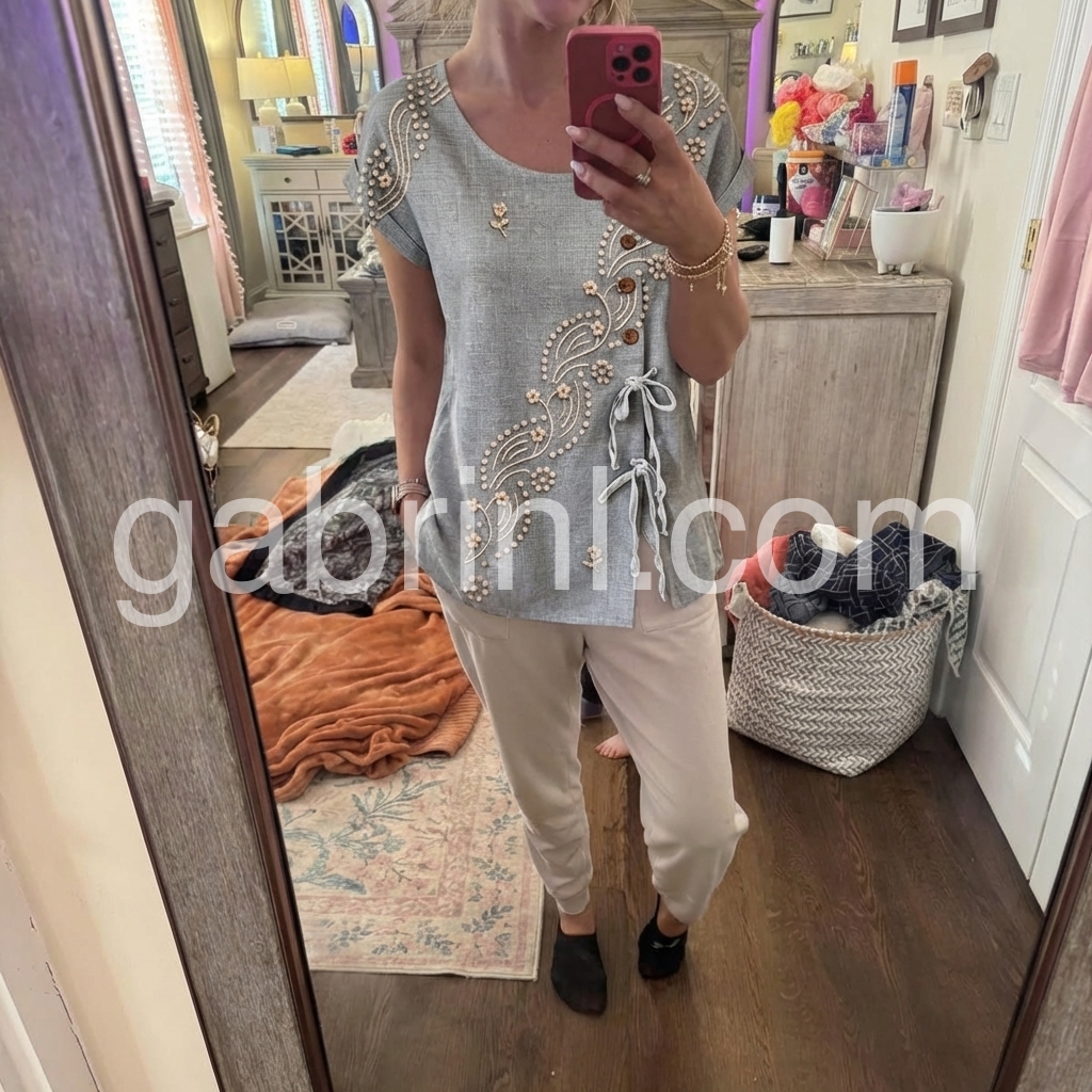 This blouse blends artisanal detail with feminine charm. The muted gray base, adorned with delicate floral and dot embroidery, evokes timeless sophistication.