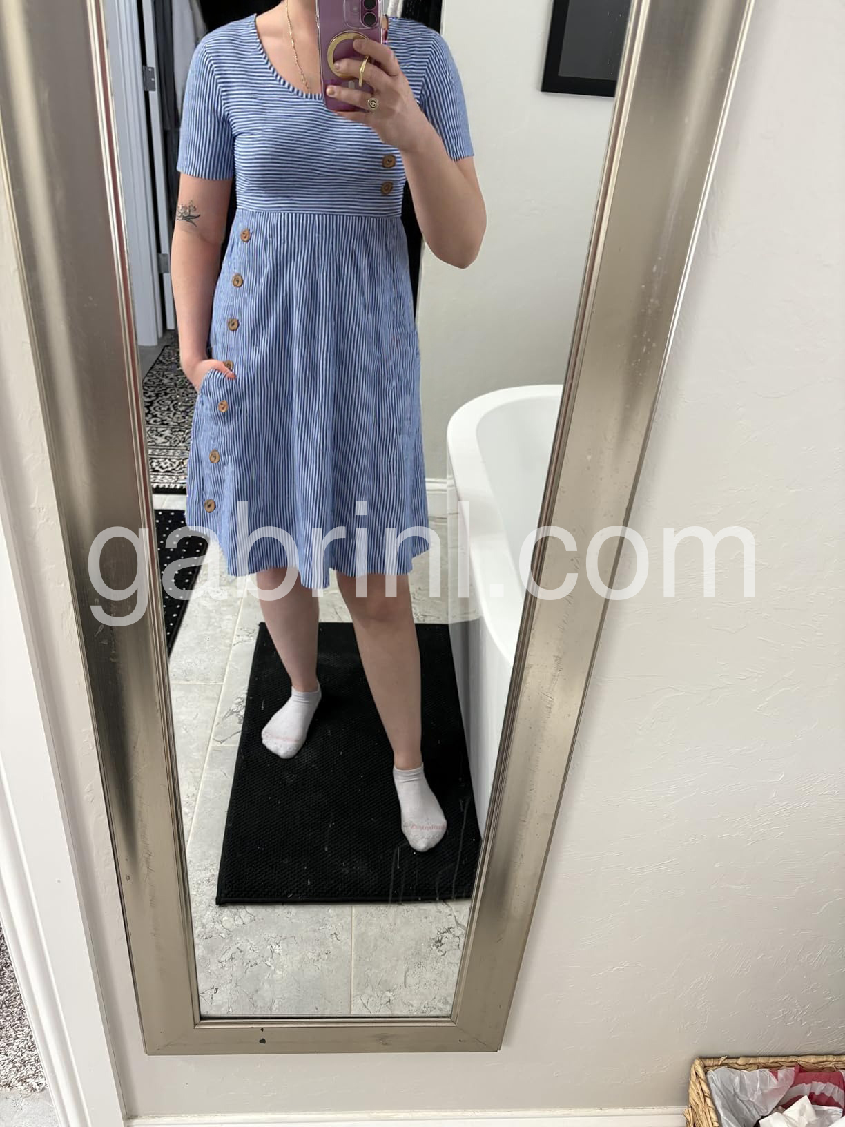 Elevate your fashion game with our Blue Striped Short Sleeve Midi Dress. Made with high-quality material, this dress features a stylish striped design and comfortable short sleeves. Perfect for any occasion, this dress allows you to effortlessly make a statement while staying comfortable and chic.