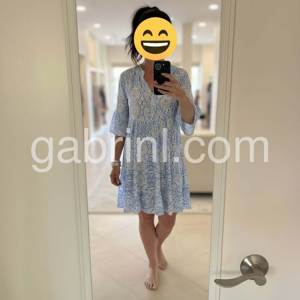 Weathered Blue White Vintage Print Half Sleeve Mini Dress