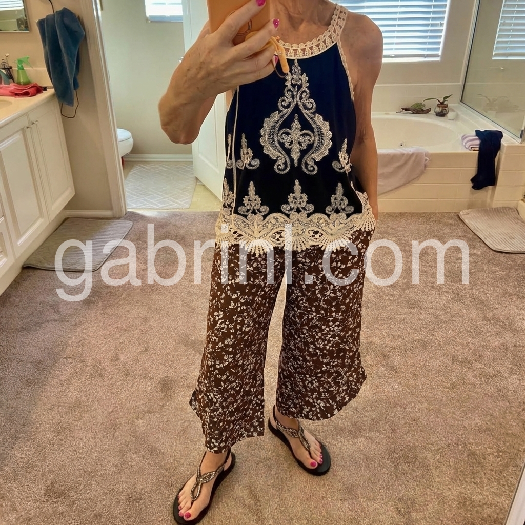 These high-waisted culottes feature a delicate white floral print on a rich brown base. Wide-leg design with an asymmetrical hem for a stylish flair. Elastic waistband for comfort and ease. Lightweight fabric perfect for warm weather. Ideal for casual outings or boho-chic looks.