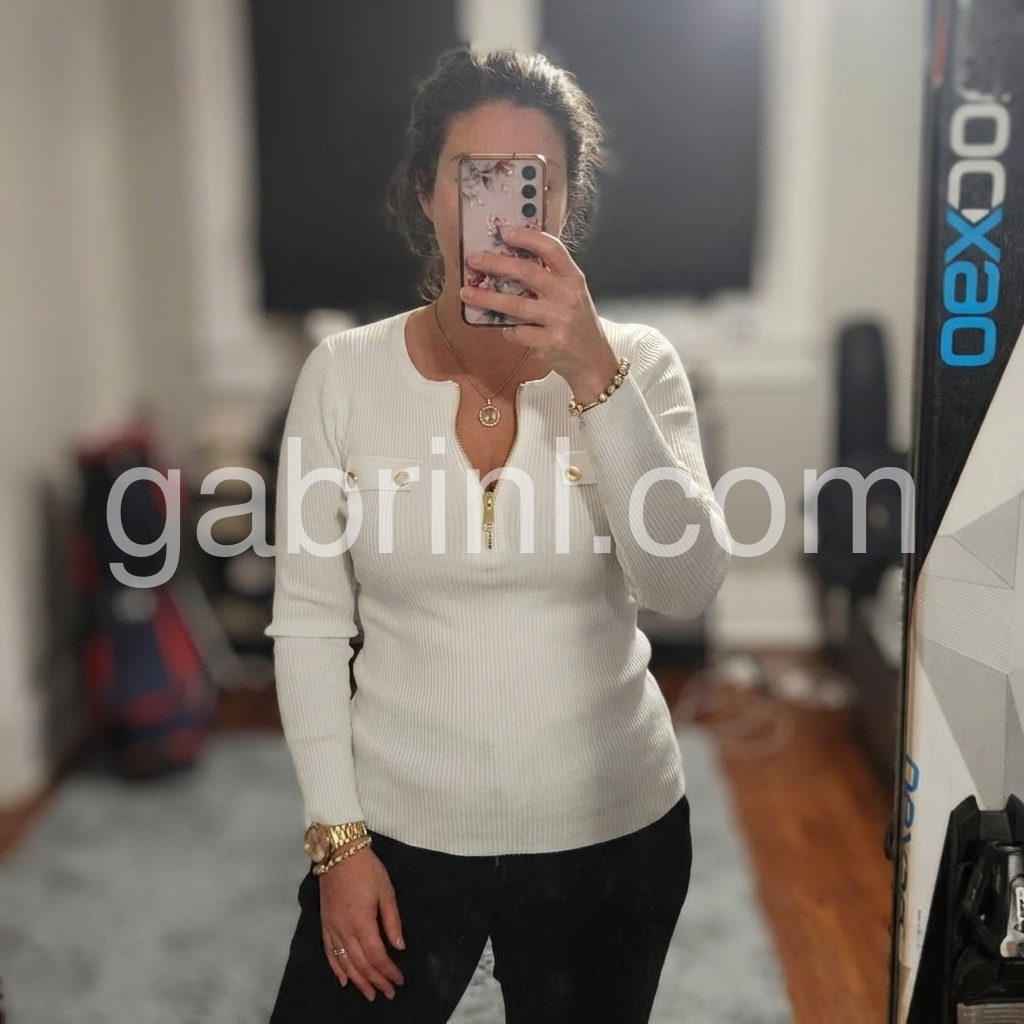 Chic Zip V-Neck White Plain Knit Top