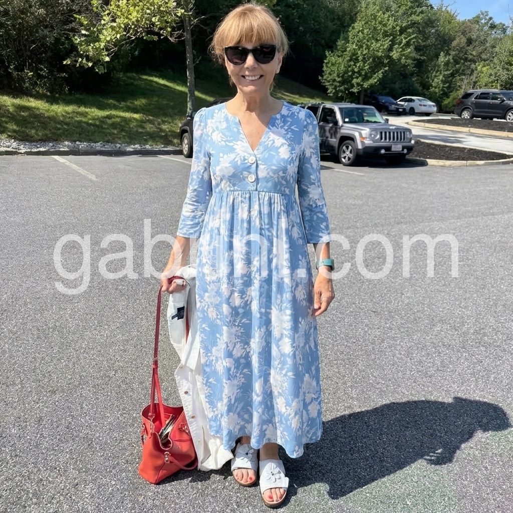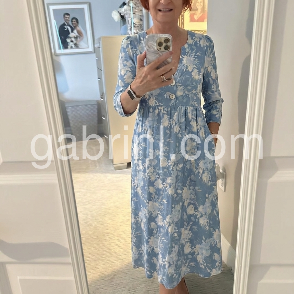 This dress is a study in soft, timeless femininity. The muted blue base, printed with delicate watercolor-style white florals, evokes a gentle, romantic sensibility.