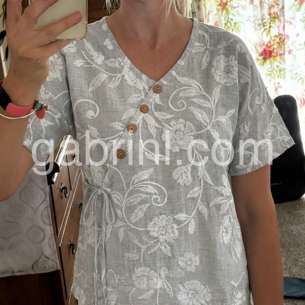 This short-sleeve top features a soft gray base with white floral print. V-neckline with wooden buttons and side tie detail. Relaxed fit for all-day comfort. Lightweight fabric perfect for casual wear. Ideal for pairing with jeans or pants.