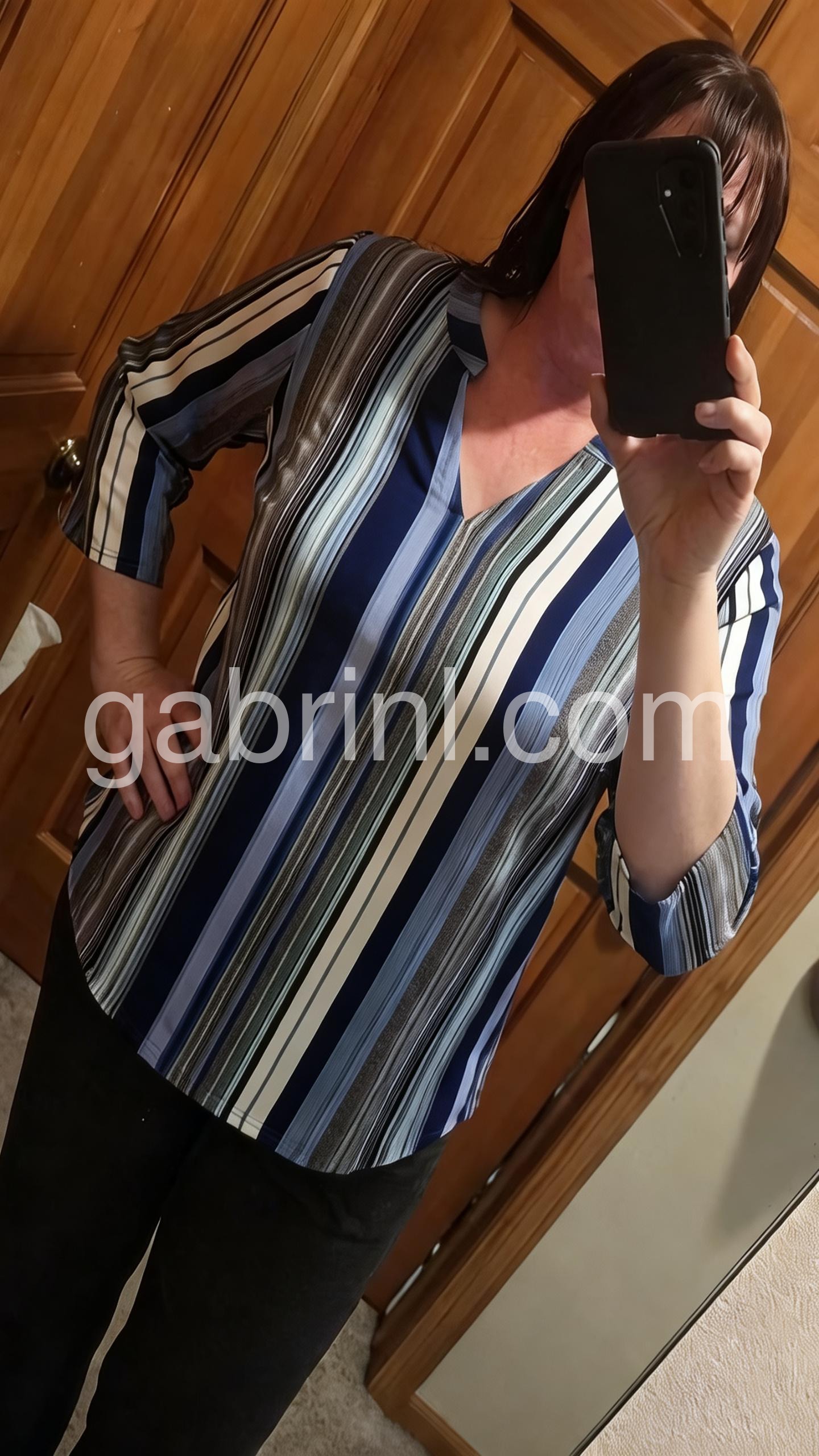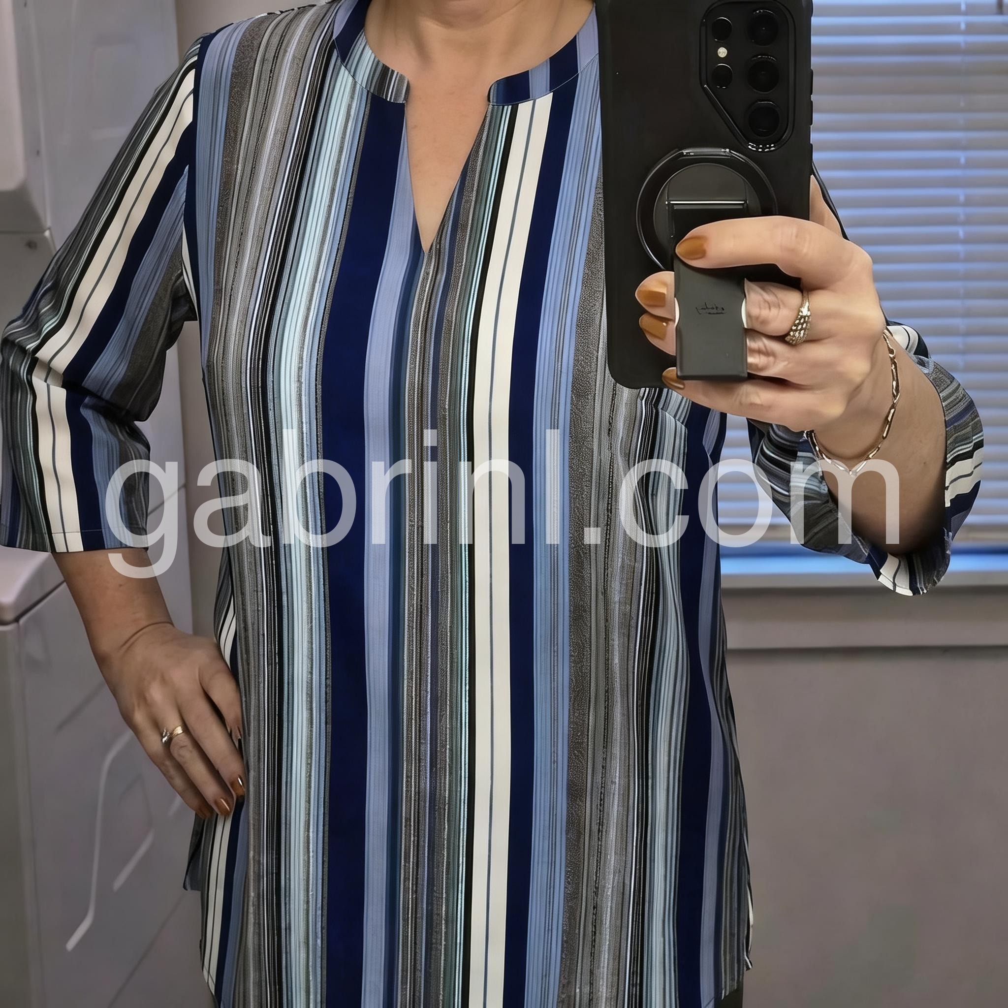 This loose-fitting top features vertical stripes in navy, blue, white, and gray for a modern look. The V-neck design adds a touch of elegance. Three-quarter sleeves with rolled cuffs offer comfort and style. Perfect for pairing with jeans or pants. Effortlessly chic for everyday wear.
