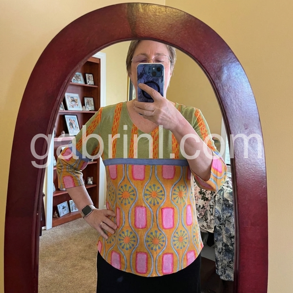 This three-quarter sleeve top features a bold, abstract pattern with geometric and floral motifs. The V-neck design adds a flattering touch. Lightweight fabric perfect for casual wear. Pair with jeans or shorts for a fun, bohemian look. Ideal for warm weather and relaxed outings.