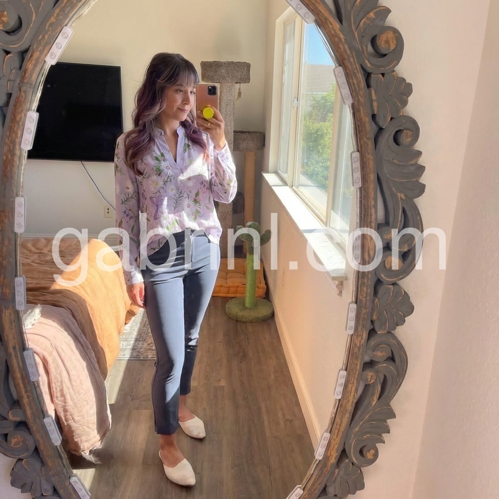 This long-sleeve top features a delicate lavender base with floral and butterfly prints. The keyhole neckline adds a touch of elegance. Lightweight fabric for comfort and breathability. Perfect for spring or casual outings. Pair with jeans or skirts for effortless style.