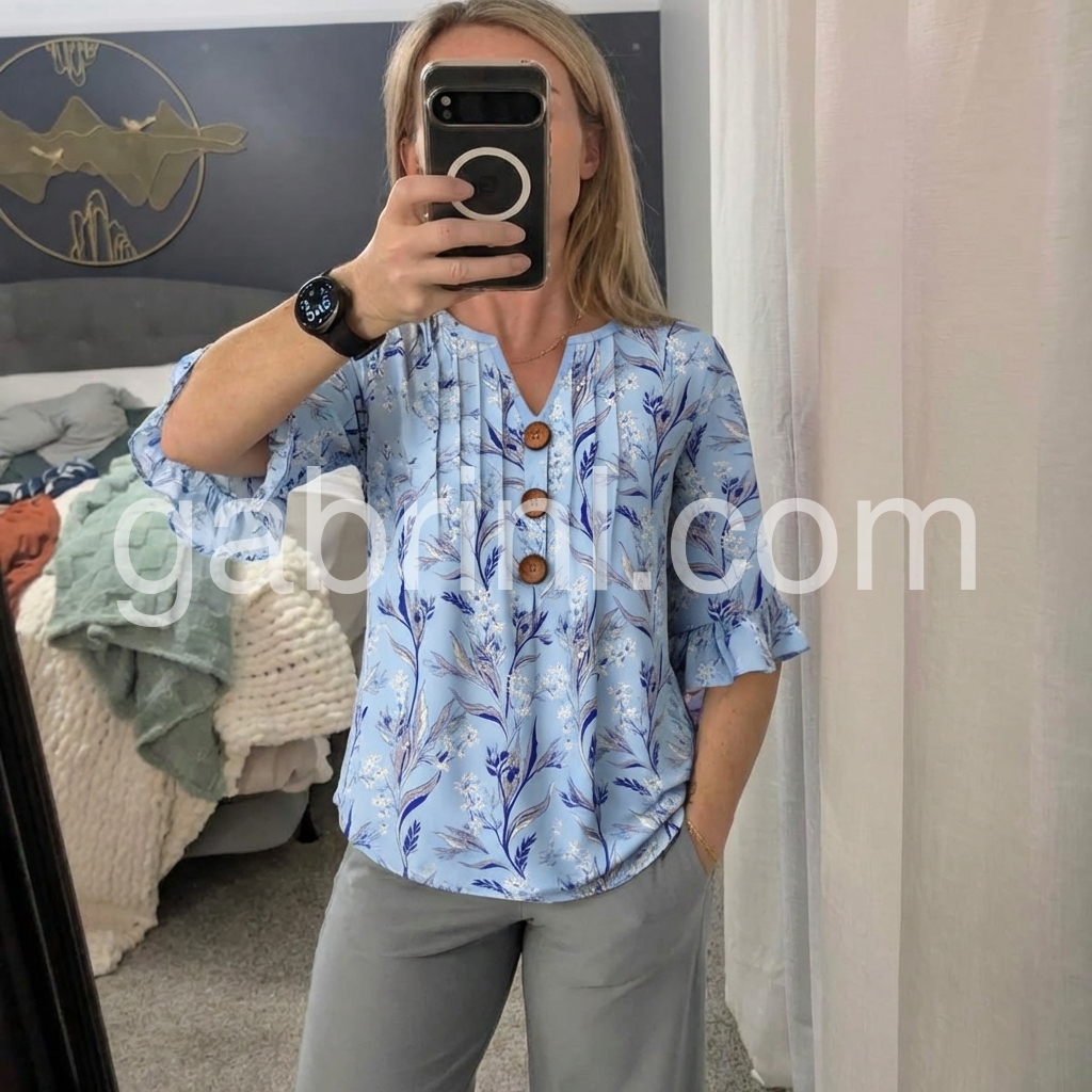 This blouse embodies effortless, feminine elegance. The soft sky-blue base, printed with delicate blue florals and foliage, feels endlessly romantic.