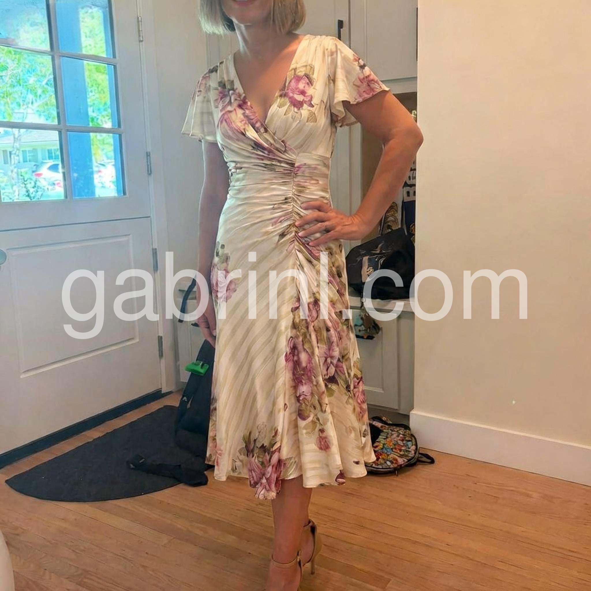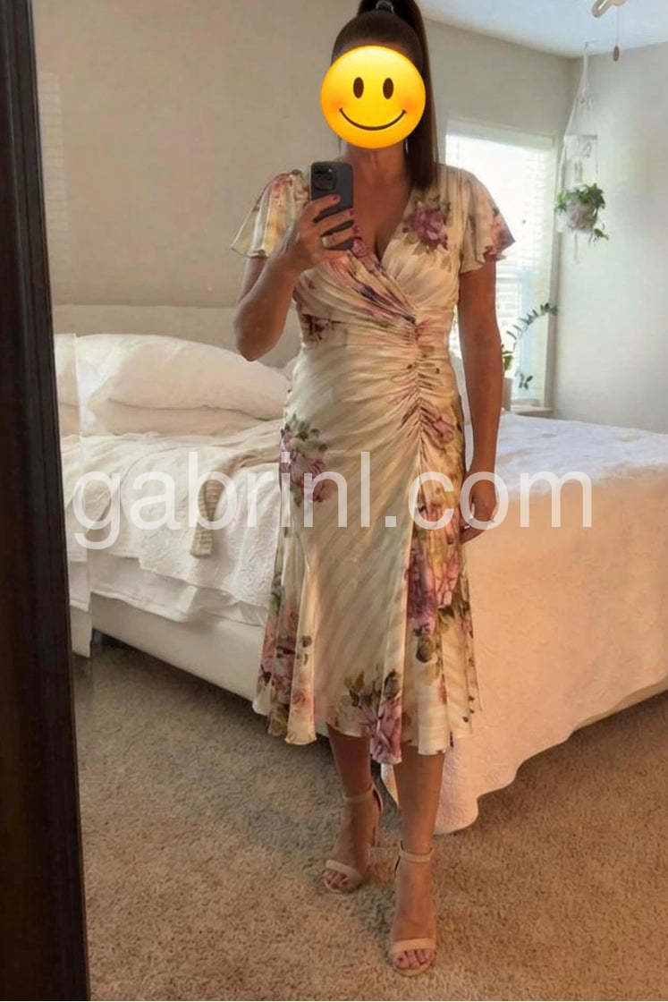 This exquisite cream satin midi dress exudes timeless elegance with its soft floral print of blush pink roses and delicate greenery, set against a subtle striped background. The wrap-style design features a deep V-neckline and a ruched waist that accentuates the figure, creating a flattering silhouette. Flutter sleeves add a romantic touch, while the flowing A-line skirt moves gracefully with every step. Crafted from luxurious satin fabric, it has a smooth, lustrous finish perfect for special occasions or sophisticated evening wear. Paired with strappy heels, layered necklaces, and a small clutch, this dress captures vintage charm with modern refinement. Ideal for garden parties, bridal showers, or elegant dinners, it’s a statement piece that blends femininity, grace, and classic beauty—making it a must-have for any fashion-forward wardrobe.