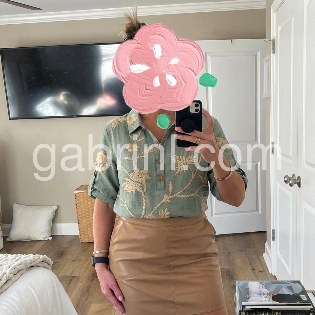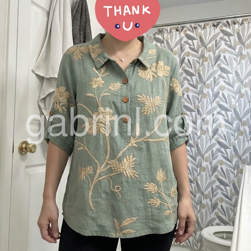 This blouse is a celebration of artisanal luxury. The muted sage base, adorned with intricate golden floral embroidery, evokes timeless sophistication.