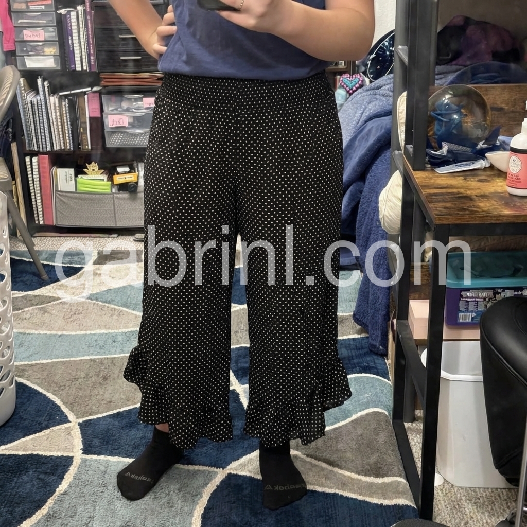 These high-waisted culottes feature a black base with tiny white polka dots. Wide-leg design with ruffled hem for a soft, flared look. Lightweight fabric perfect for warm weather. Ideal for casual outings or relaxed styles. Comfortable and effortlessly chic.