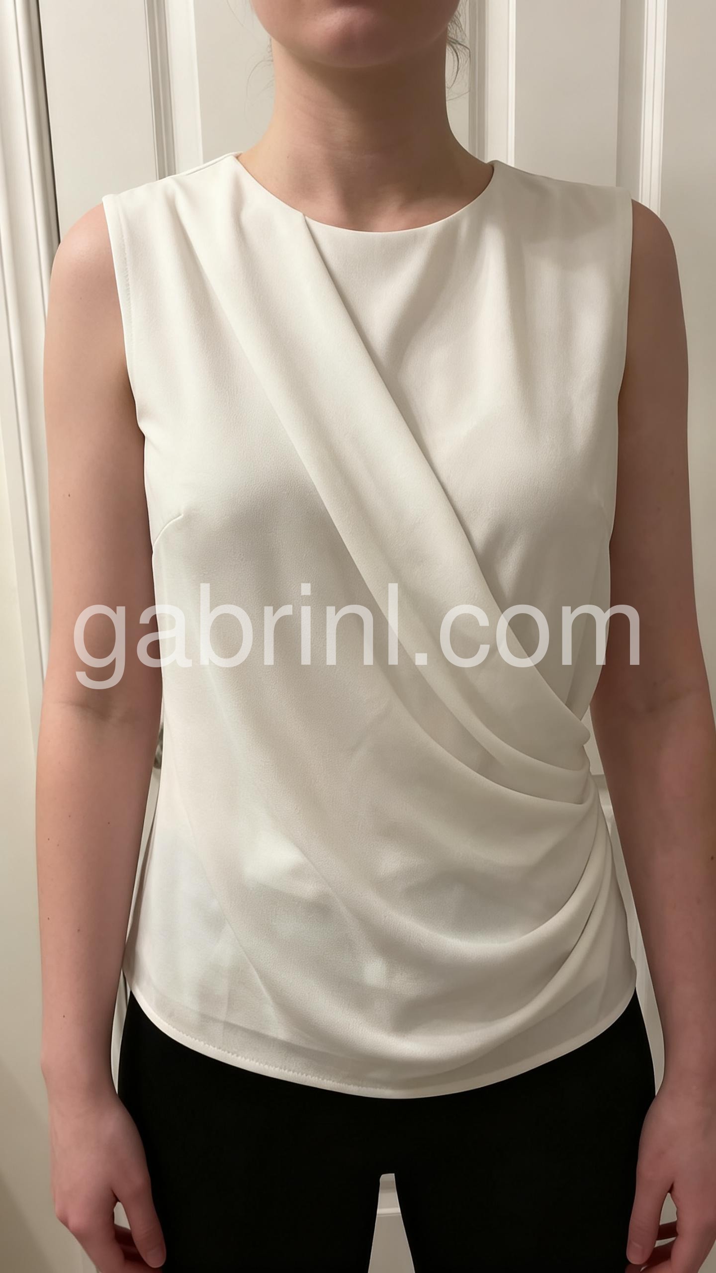 This sleeveless top features a clean white design with a stylish diagonal drape. The soft fabric creates a fluid, modern silhouette. Perfect for pairing with trousers or skirts. Ideal for office wear or minimalist outfits. Effortlessly chic and timeless.
