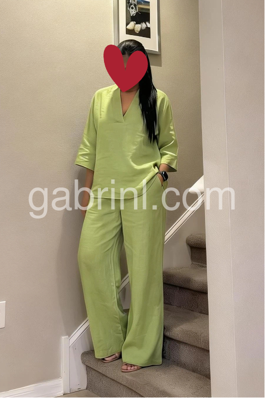 This coordinated set features a relaxed V-neck top and wide-leg pants in soft, breathable linen. The solid lime green hue offers a fresh, natural look. Perfect for warm weather and casual wear. Ideal for beach days or effortless everyday style. Comfortable and elegantly simple.