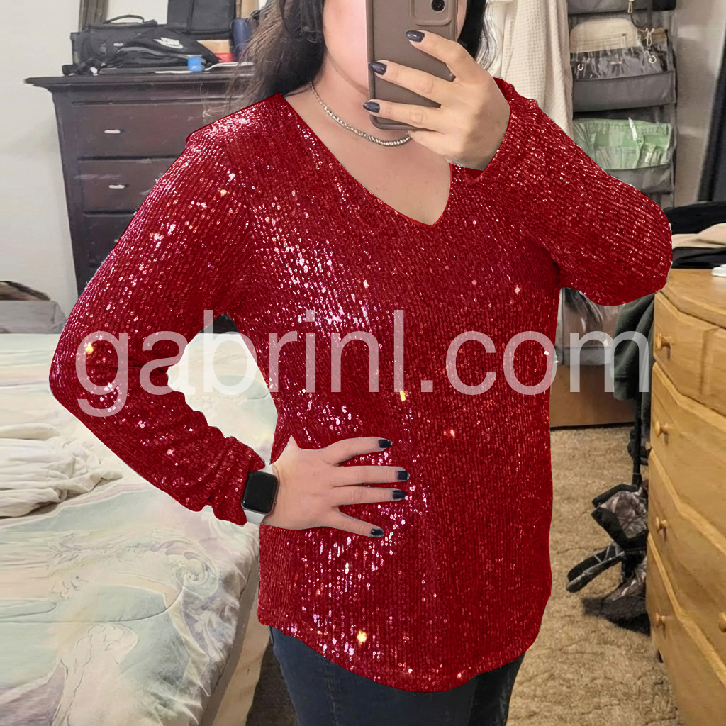 Don't miss out on this beautiful v-neck top! The intricate sequin detailing is sure to make a statement and the v-neck cut gives it a modern feel. This top is perfect for any special occasion or night out.