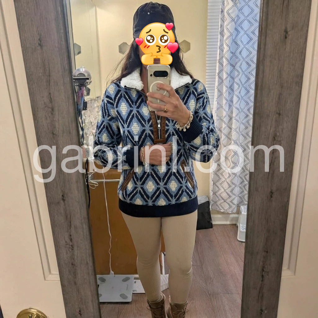 Elevate your cold-weather wardrobe with this sophisticated knit sweater, featuring a striking blue geometric pattern that adds visual interest to any ensemble. The fleece lining provides exceptional warmth and comfort, making it an ideal choice for layering or standalone wear during transitional seasons. Crafted from quality knit fabric, this piece combines contemporary design with practical functionality. The geometric detailing brings modern flair while maintaining versatility—pair it effortlessly with jeans, trousers, or skirts for polished everyday styling.