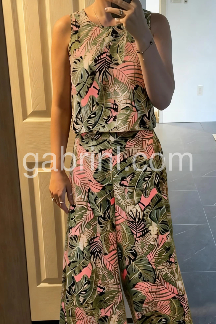 This coordinated set features a sleeveless crop top and wide-leg pants in a bold tropical leaf print. The mix of green, pink, and black creates a lively summer vibe. Lightweight fabric for comfort and ease. Perfect for beach days or casual outings. Effortlessly stylish with a nature-inspired flair.