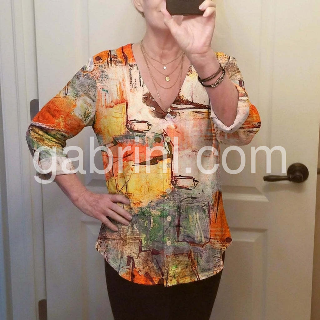 Make a bold fashion statement with this Chic Abstract Watercolor Print Top, a one-of-a-kind top that turns wearable art into everyday elegance. Crafted from soft, lightweight fabric—likely cotton or rayon blend—this blouse features a vibrant, painterly design inspired by watercolor strokes and abstract expressionism. The print blends warm tones of orange, rust, mustard, teal, and cream, creating a dynamic and artistic look that’s both eye-catching and sophisticated. Styled here with distressed denim and layered jewelry, it’s ideal for weekend outings, creative gatherings, or adding a burst of personality to your daily wardrobe. Whether you're heading to brunch or exploring the city, let this abstract-print top elevate your style with creativity, comfort, and boho flair.
