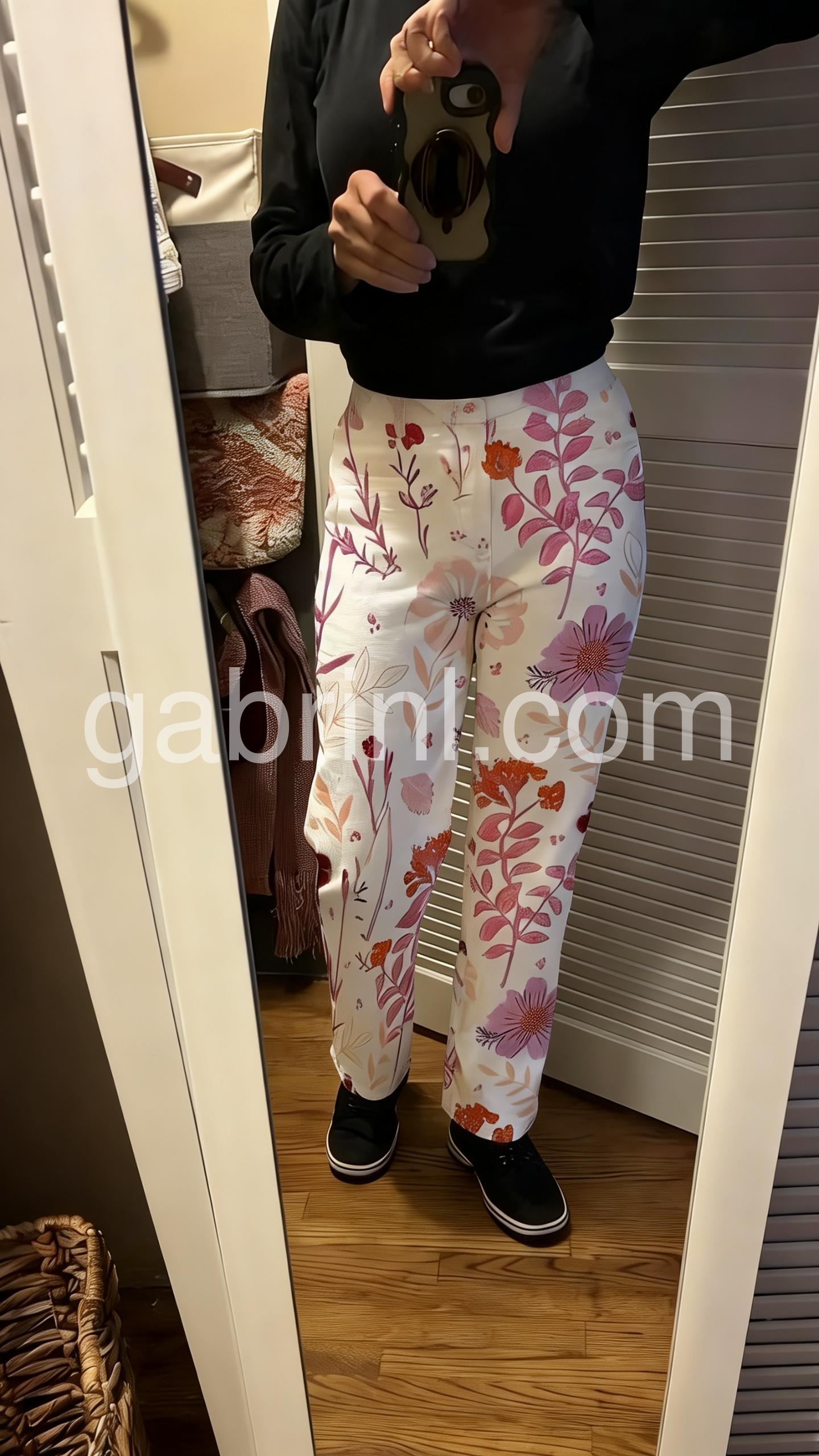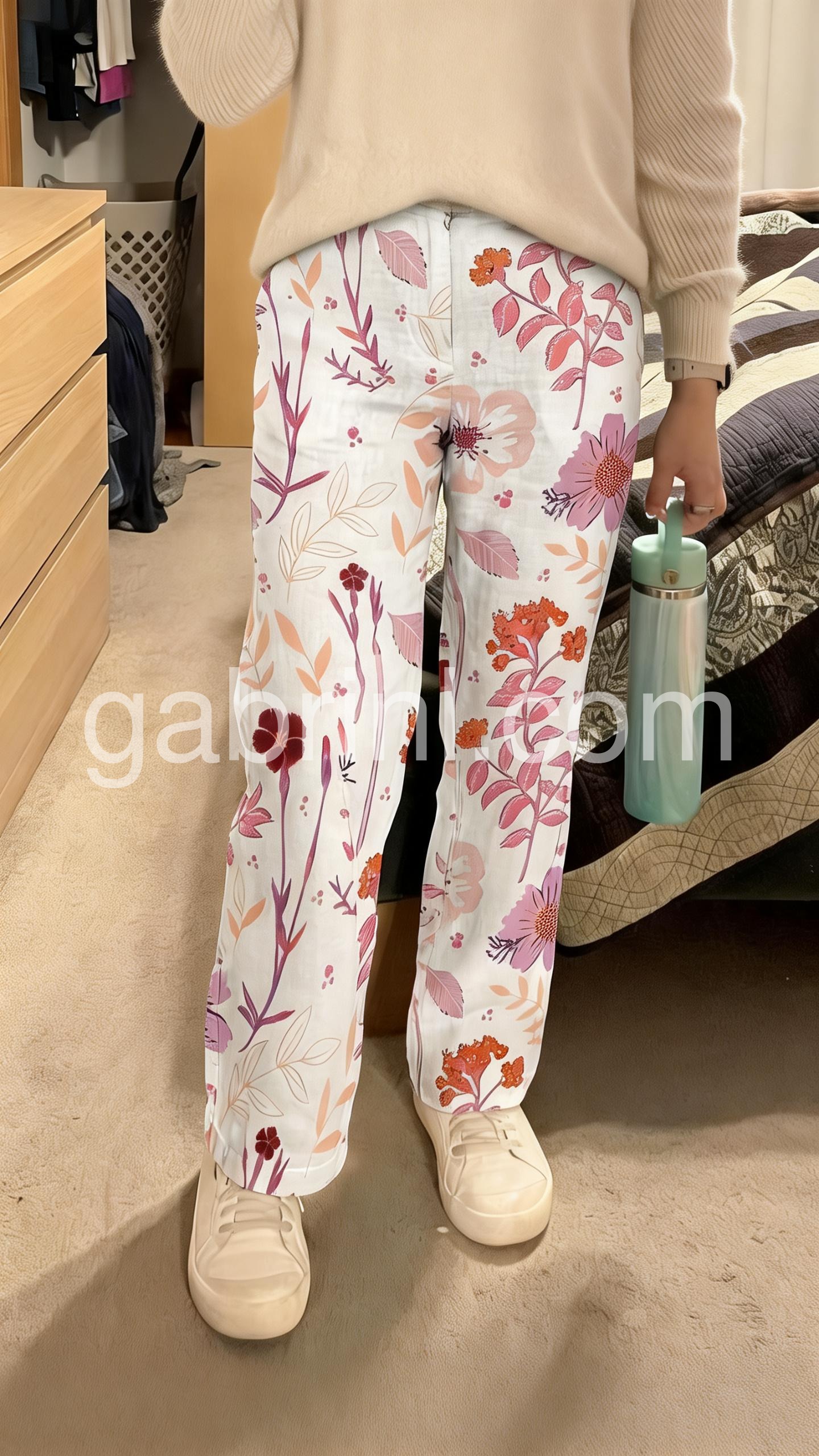 These loose-fit pants feature a vibrant floral pattern in soft pinks, purples, and oranges on a white base. Elastic waistband with side pockets for comfort. Wide-leg design with a relaxed, flowing silhouette. Perfect for casual wear or garden outings. Lightweight fabric ideal for warm days.