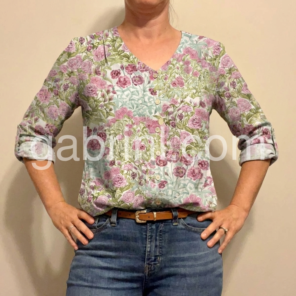 This long-sleeve top features a delicate pink rose pattern on a light background. The V-neck and button-down front add a classic touch. Lightweight fabric perfect for casual wear. Pair with jeans or skirts for a charming look. Ideal for spring and summer days.