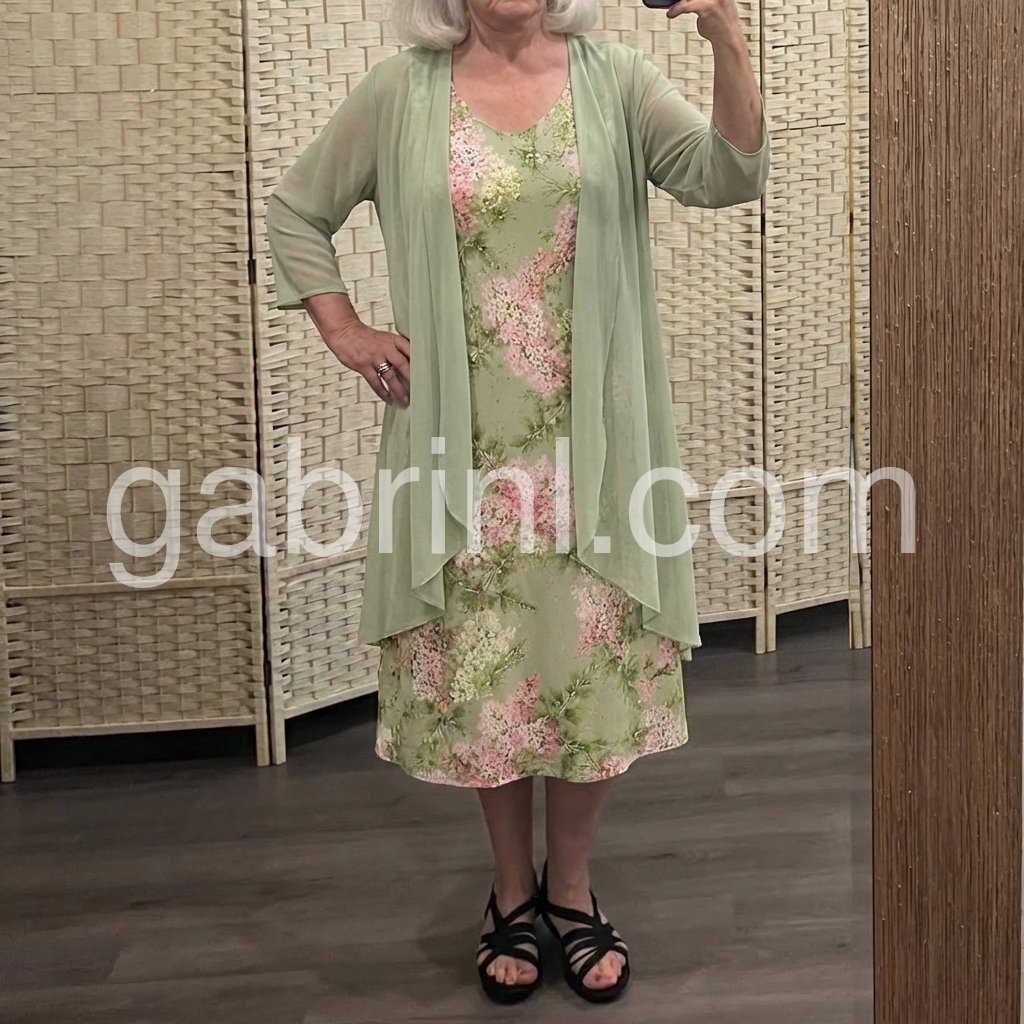 This soft floral dress features a light green base with pink and white blossoms. Paired with a matching sheer duster for a layered look. V-neckline and relaxed fit perfect for warm days. Ideal for garden parties or casual outings. Fresh and feminine style.
