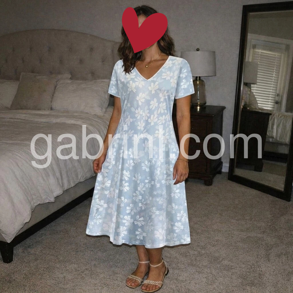 This midi dress is a love letter to soft, feminine style. The sky-blue base, printed with delicate white florals, feels endlessly romantic.